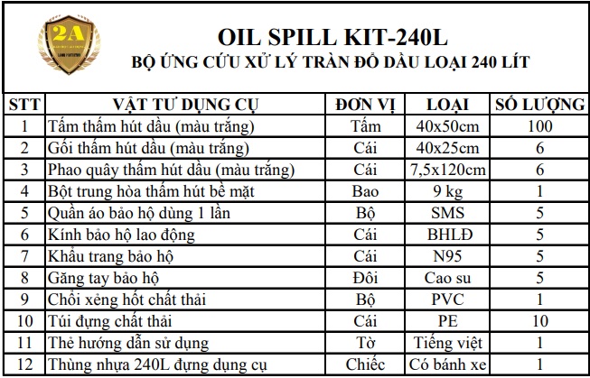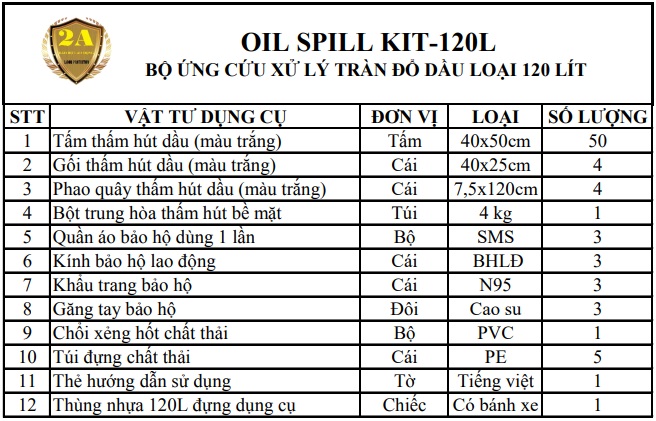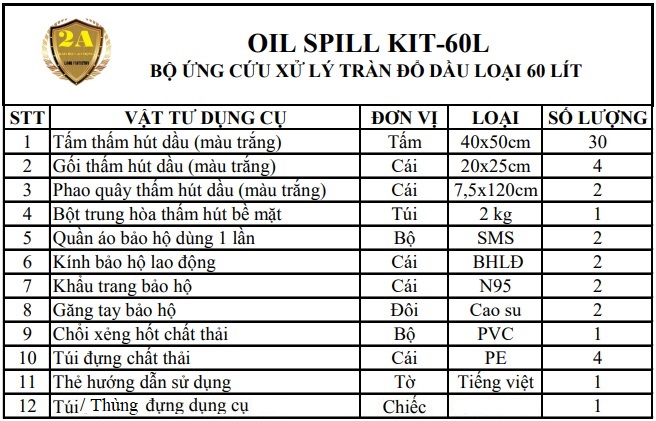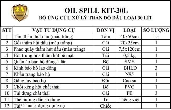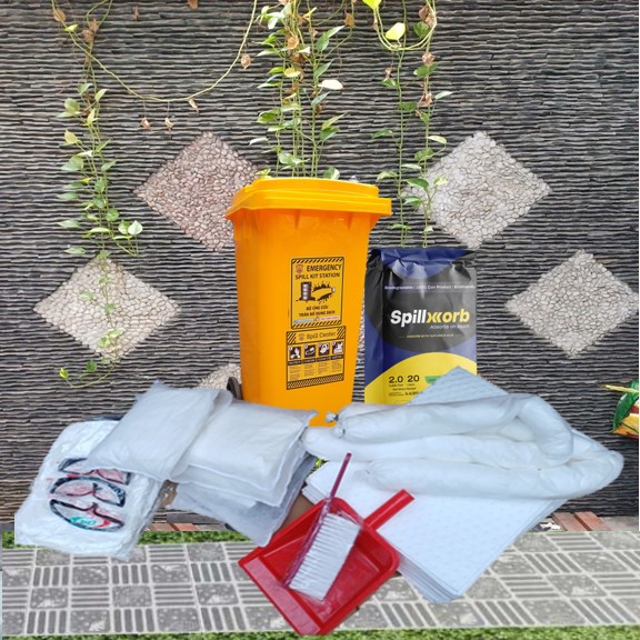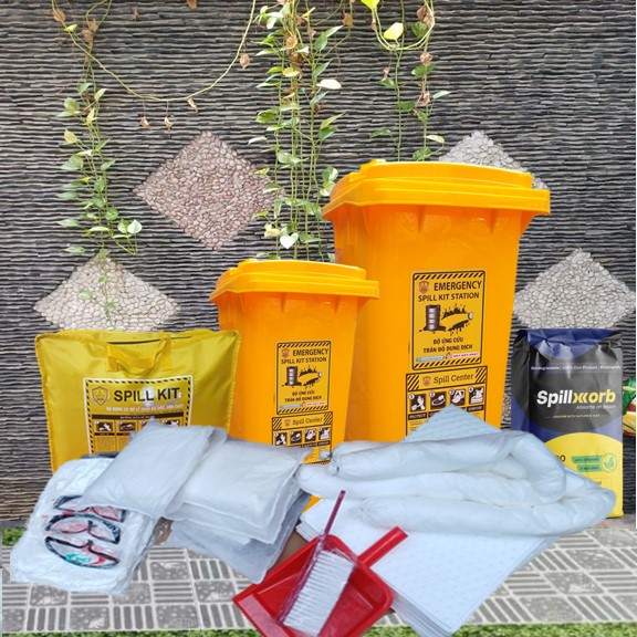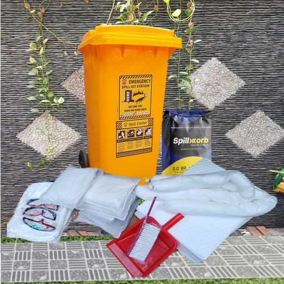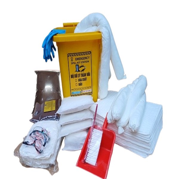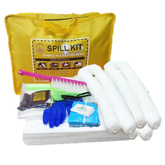 OIL SPILL KIT. Bộ dụng cụ ứng phó, xử lý sự cố tràn đổ dầu và chất gốc dầu do chúng tôi thiết kế với mục đích ứng phó, xử lý các tình huống sự cố như: Tràn đổ, rò rỉ, rơi vãi với quy mô vừa và nhỏ trên nền sàn cứng. Các vật tư có trong bộ ứng phó khẩn cấp có khả năng thấm hút nhanh, xử lý hiệu quả, kể cả với người lao động không chuyên cũng sử dụng được một cách dễ dàng khi có sự cố xảy ra.